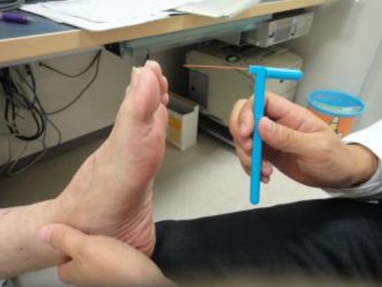 足の裏を、柔らかくて細いナイロンの糸で触り、足の裏の感覚がどの程度あるか調べる検査です。