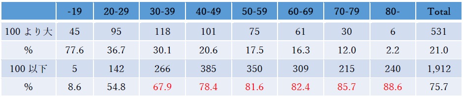 カットオフ値以上であっても、感染は防げない。事実、中和活性が100程度であっても、ブレイクスルー感染は確認されている(ただしこれらの情報は、デルタ株を基に示されているので、オミクロン株ではデルタ株より高い抗体価が感染防御に必要と予想される点に注意が必要である)。目安として、中和活性が100以下の方の割合を示してみた(図表2)。30代以上では、ほとんどの方が12月の時点で、中和活性が100以下であった。今回参加してくれた方々については、わりと若い方であっても、ブレイクスルー感染の心配があるということだ。