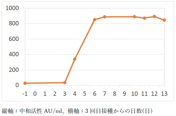 最後に、筆者の3回目接種後の中和活性についてもお示ししたい(図表5)。筆者の中和活性は、3回目接種を行った日から、3日目くらいを境に急増し、接種1週間後には高い値に達した。筆者が3回目接種を行ったのは12月のはじめなので、これだけ中和活性が高かったからといって、今オミクロン株に感染しないとは思っていない。もちろん毎日注意して生活している。